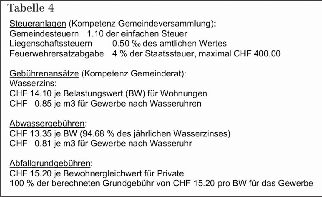 Die vorstehenden Ergebnisse basieren auf folgenden unveränderten Steueranlagen und Gebührenansätzen (Tabelle 4).