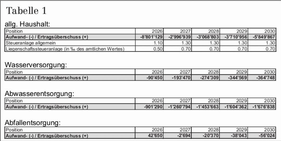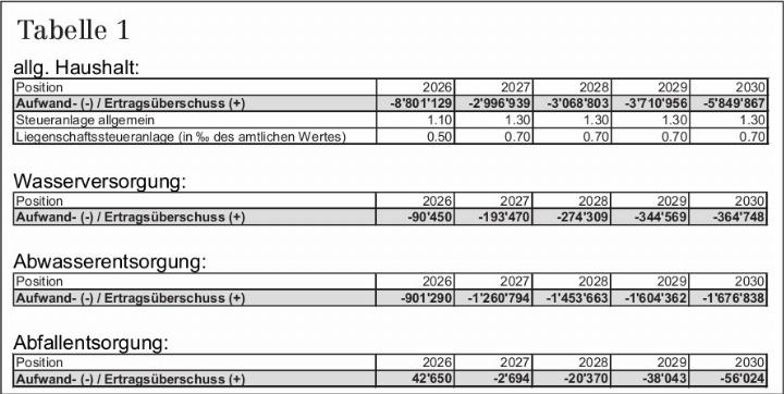 Der Finanzplan 2026–2030 wurde aufgrund der Eingaben aus den verschiedenen Fachbereichen erstellt, durch die Finanzkommission vorberaten und durch den Gemeinderat verabschiedet. Mit den nachstehenden Annahmen werden die folgenden Ergebnisse prognostiziert (Tabelle 1).