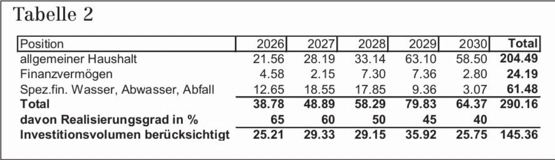Im Jahr 2026 sollen Nettoinvestitionen von insgesamt CHF 34.1 Mio. realisiert werden. Zusammen mit der negativen Selbstfinanzierung aus der Erfolgsrechnung ergibt sich damit ein Finanzierungsfehlbetrag von ca. CHF 38.8 Mio. Dieser Betrag wird über vorhandene Reserven sowie neues Fremdkapital zu finanzieren sein.