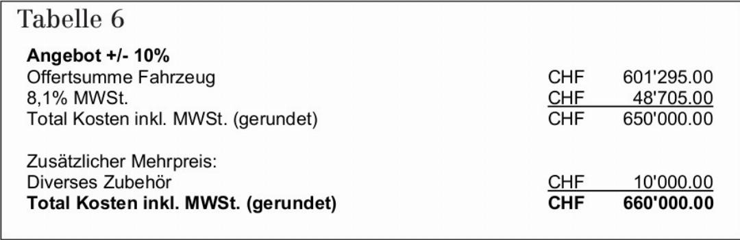 Die Beschaffung des Tanklöschfahrzeugs wurde in Zusammenarbeit mit der Beschaffungsgruppe der Feuerwehr Saanen erarbeitet und öffentlich auf simap.ch ausgeschrieben. Das Angebot sieht folgendermassen aus (Tabelle 6).