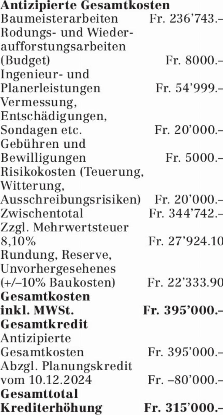 Fr. 50’000.– um Fr. 360’000.– auf neu Fr. 410’000.–. Damit können neue Ausweichstellen gebaut und die Strasse punktuell verbessert werden.