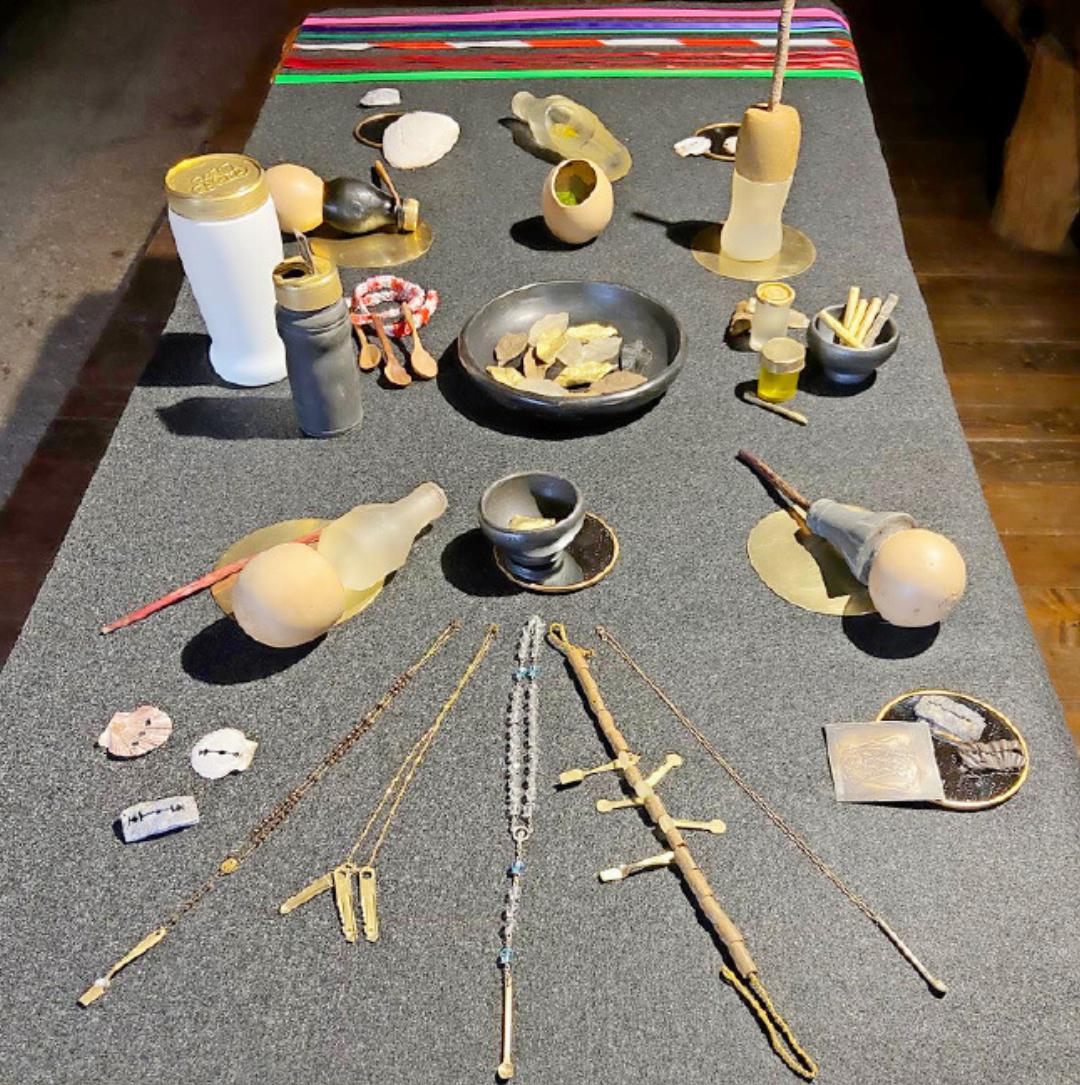Lucía Moures «Altar de coca» widmete sich der kulturellen, rituellen und spirituellen Bedeutung der Kokapflanze jenseits westlicher Kriminalisierungsnarrative. In einer altarähnlichen Anordnung, inspiriert von andinen Kosmologien, verband sie Messing, Glas und mit Koka- und Tabakpulver versetzte Materialien. Die Arbeit unterschied klar zwischen dem Kokablatt als anzestralem Wissensträger und seiner kolonialen wie später chemischen Umdeutung.