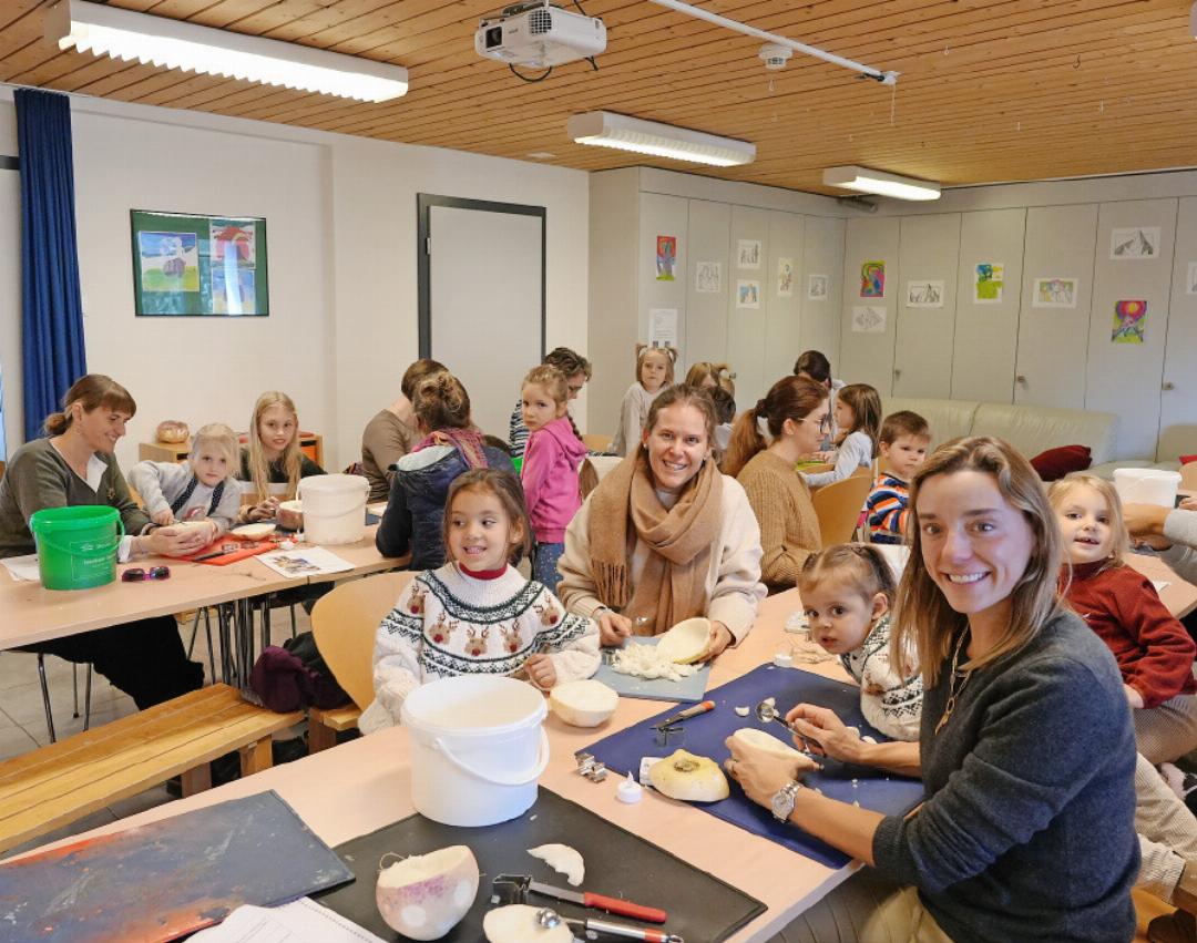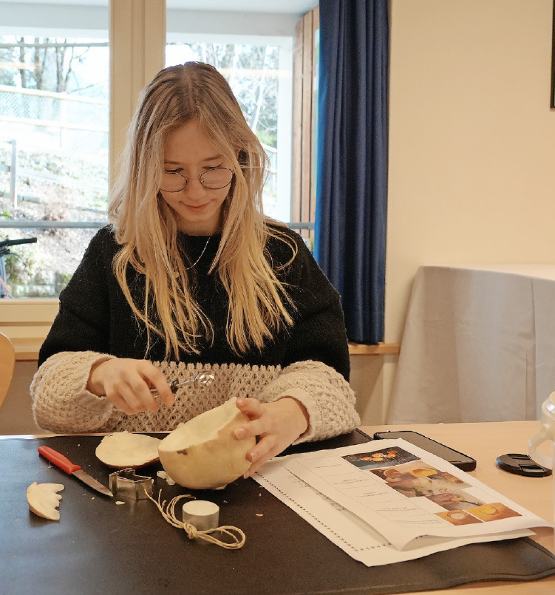 Es beginnt um 14 Uhr im Chinderhuus Ebnit Gstaad. Wir werden alle sehr freundlich von den Mitarbeitenden begrüsst und uns wird angeboten, dass wir uns doch etwas von dem kleinen Buffet nehmen können, das sie extra aufgestellt hatten (Schokolade, Gebäck und Getränke). Fünf Minuten später bekomme ich von 60 Herbstrüben, mein «Räbeli» in die Hand gedrückt, gemeinsam mit einem Anleitungszettel, der mir sehr verständlich und einfach die Schritte zur perfekten Laterne zeigt. Zuerst musste ich den Deckel der Rübe abschneiden. Nach dreimaligem Verschneiden und ein bisschen Rübe weniger, habe ich es endlich geschafft. Es ist ja noch kein Profi vom Himmel gefallen. Mit improvisierten Werkzeugen wie einem Küchenmesser und einem Löffel, der aussah wie eine Eiskelle, ging es rein ins Gefecht. Um mich herum sind viele Kinder, die von 0 bis 14 Jahre alt sind. Gemeinsam mit ihren Eltern schnitzen sie eine Laterne. Manche Kinder lassen ihren kreativen Geist frei und stechen mit Förmchen Muster in die Zuckerrübe, während andere wie wild den Eltern helfen, die Rübe auszuhöhlen. Ich suche mir ein einfaches Muster aus, nicht zu schwer (ein Gesicht mit zwei Runden Augen und einem Mund). Mit viel Präzision und Ungeschick, schnitze ich das «Smiley-Gesicht» in die Rübe, wobei mir im Nachhinein gesagt wird: «Das ist viel zu dick geworden und deswegen kann es nicht durch die Augen leuchten». Na gut, Immerhin sieht es süss aus. Nach dem Muster wird die Rübe ausgehöhlt und es werden Luftlöcher in den Deckel gebohrt, damit die Kerze nicht ausgeht und erstickt. Wenn ich so darüber nachdenke, hat das Schnitzen etwas Meditatives an sich, die Zeit ging sehr schnell vorbei und so bin ich auch am letzten Schritt angelangt: Die Bänder befestigen. Hierfür muss man vier zusätzliche Löcher bohren, damit man die Schnüre befestigen kann. Nach einem Misslungenen Versuch sitzen die Seilchen fest und ich habe mein fertiges, eigenes «Räbeliechtli» in der Hand!