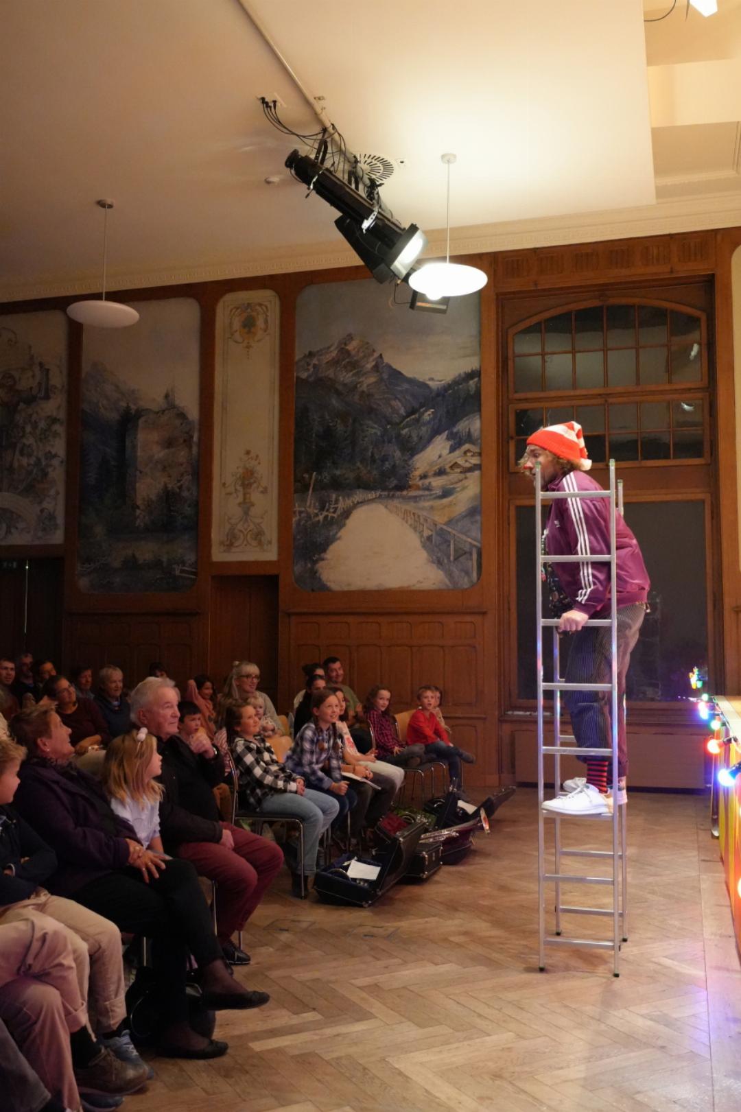 «Jaaa», rufen die Kinder jeweils lautstark, wenn Kasperli fragt: «Sind ihr alli da?» Ganz ähnlich tönte es auch am Samstagnachmittag im Landhaussaal. «Bym Vorhang sy si», ruft es aus Dutzenden Kinderkehlen, als Clown Jeanloup gesteht, dass er leider seine zwei Leitern zu Hause vergessen habe. «Muesch di umdräie», «vor em Vorhang» – werden die Rufe noch lauter und präziser, als der Clown wieder und wieder in die falsche Richtung läuft. Endlich sieht er die beiden Metallleitern. Und natürlich klappt auch das Kunststück nicht auf Anhieb, immer wieder droht eine der Leitern zu kippen. «Cha mer bitte öpper hälfe…?» Kaum gefragt, schnellen viele Kinderhände in die Höhe.