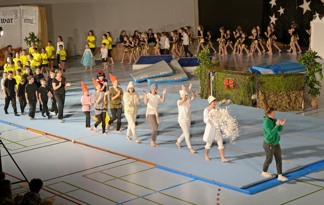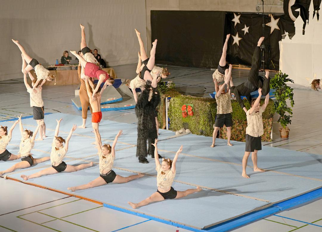 Das grosse Finale bildete «Das Dschungelbuch». In einer farbenfrohen Dschungellandschaft stürmten die Mitglieder der Aktivriege in Affenkostümen auf die Bühne. Auch die Hauptfiguren des «Dschungelbuchs» waren vertreten: Balu, Bagheera, Mogli, Shir Khan und König Louie – alle liebevoll verkleidet. Gemeinsam präsentierten sie eine Show aus präzise getimten Sprüngen und akrobatischen Elementen.