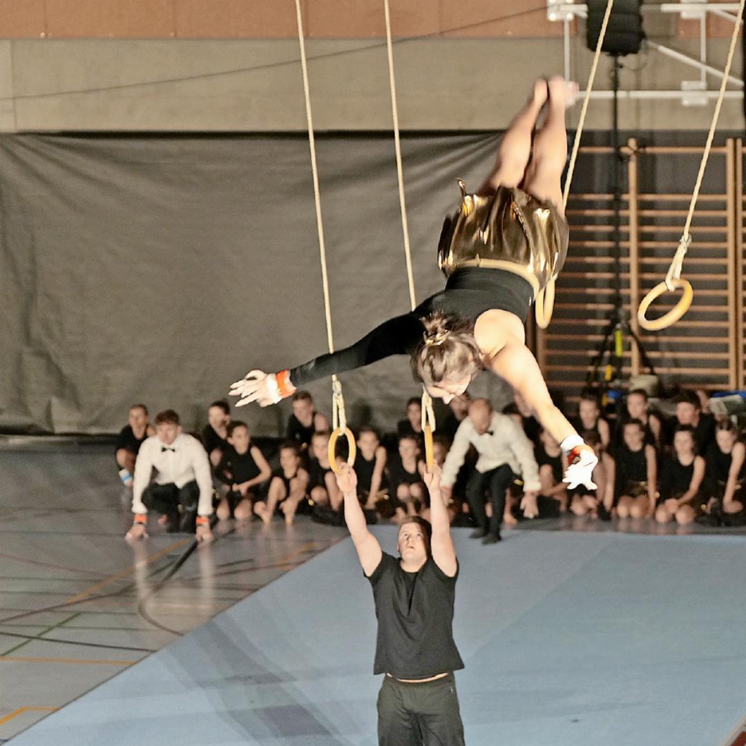 In goldenen Röcken und Hemden betraten die Mitglieder der GeTu-Gruppe die Bühne. Passend zum Mary Poppins-Thema turnten die jüngeren Kinder mit schwarzen Regenschirmen und zeigten verschiedene Kunststücke wie Rollen und Räder. Parallel dazu schwangen die übrigen Turner:innen elegant an den Ringen und beendeten ihre eindrucksvollen Bewegungen mit einem Vorwärtssalto.