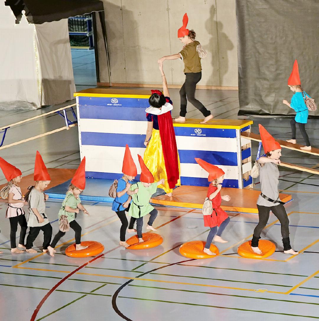 Die KiTu-Gruppe lud uns in die Welt von Schneewittchen ein. Während Schneewittchen in voller Verkleidung auftrat, waren die Kinder als Zwerge mit roten Mützen verkleidet. Sie sorgten für ein heiteres Spektakel, indem sie in einer Reihe über verschiedenste Untergründe liefen, beispielsweise über erhöhte Kästen und Bänke und dabei Kunststücke wie Rollen und kleine Sprünge zeigten.