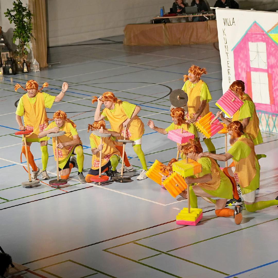 Die Hürdenlandschaft verschwand, und stattdessen wurden Gewichte sowie die gemalte Villa Kunterbunt auf die Bühne gebracht. Sobald die Mitglieder der Männerriege in voller Pippi-Langstrumpf-Montur hinter der Villa hervortraten, einige sogar mit orange gefärbtem Bart, war klar: Wir sind in der Welt der Pippi-Langstrumpf-Geschichte angekommen. Passend zum Auftritt erklang das Lied «Hei, Pippi Langstrumpf».