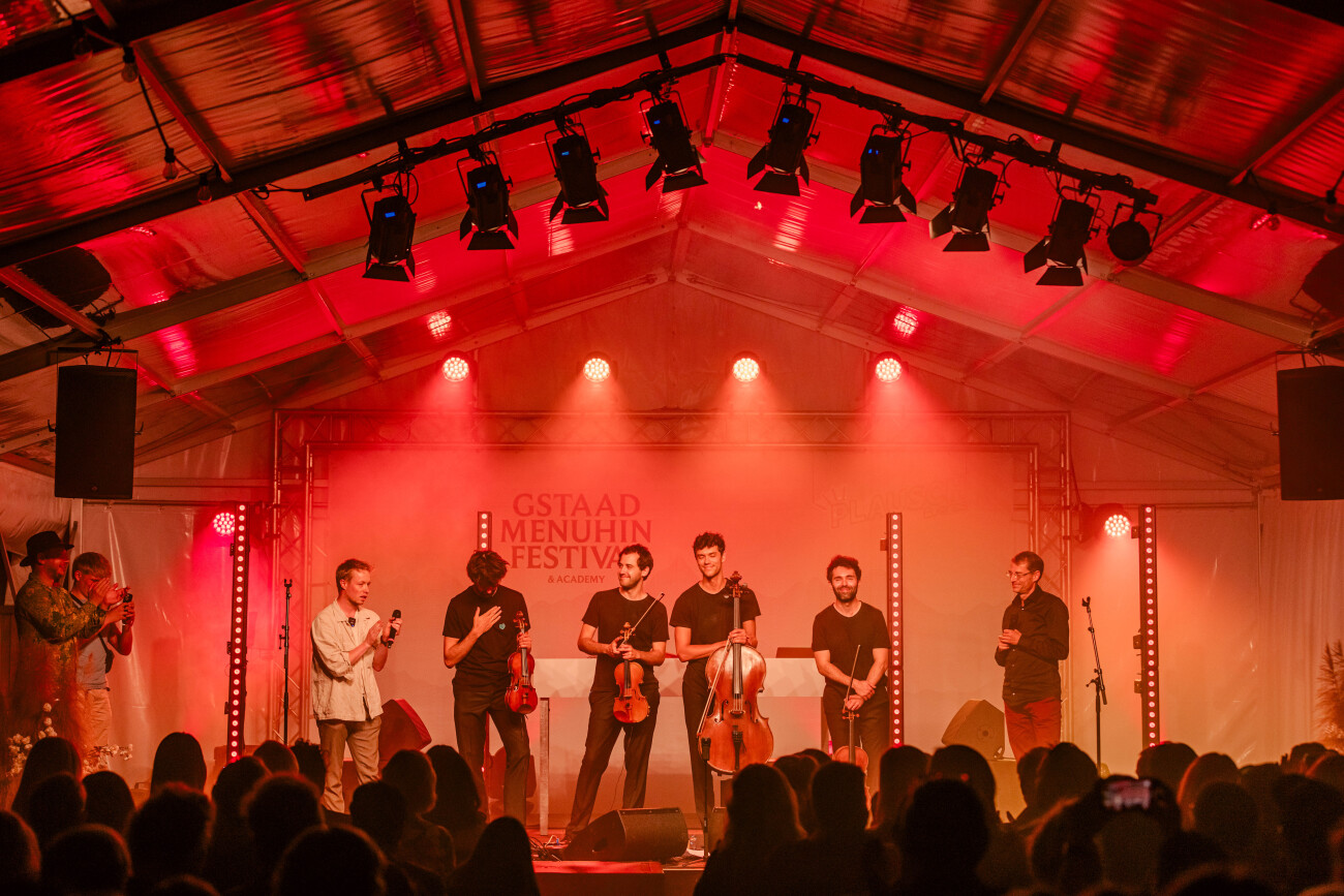 Yannic Schwenter (links) auf der Bühne mit dem «Vision String Quartet» und Christoph Müller (rechts), Artistic Director des Gstaad Menuhin Festivals. (Foto: Theresa Pawel)
