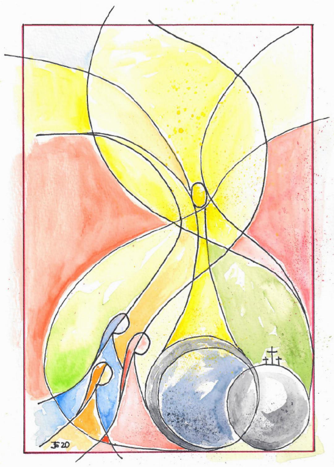 Das Bild von Judith Schneider macht die beginnende Verwandlung des Karfreitags sichtbar. Frauen machen sich am Ostermorgen auf den Weg zum Grab von Jesus. Sie wollen seinen Leichnam einbalsamieren. Sie schauen auf das Grab. Zugleich haben sie noch die Ereignisse der vergangenen Tage unmittelbar vor Augen: Jesu Leiden und Sterben am Kreuz auf dem Hügel Golgotha.