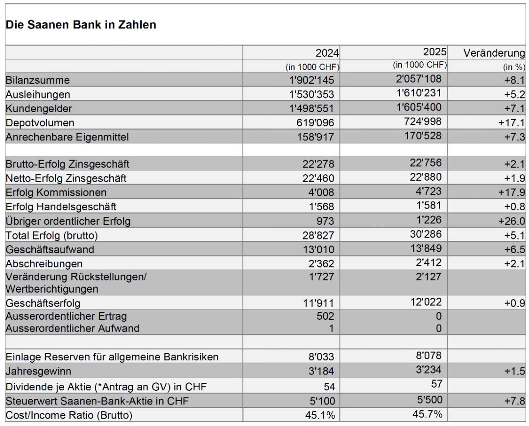 Erneut präsentiert die Saanen Bank ein erfreuliches Jahresergebnis: Der Reingewinn 2025 liegt mit CHF 3,234 Mio. 1,5 Prozent über dem Vorjahr. Erstmals in der 151-jährigen Geschichte der Bank übersteigt die Bilanzsumme CHF 2 Mia. Die anrechenbaren Eigenmittel wurden um CHF 11,6 Mio. gestärkt; sie beliefen sich Ende 2025 auf solide CHF 170 Mio. Der Verwaltungsrat beantragt eine Erhöhung der Dividende um CHF 3 auf CHF 57 pro Aktie. An der Generalversammlung vom 17. April 2026 wird Verwaltungsratspräsident Victor Steimle verabschiedet. Er übergibt sein Amt an den bisherigen Vize-Präsidenten und designierten neuen Präsidenten Daniel Matti.