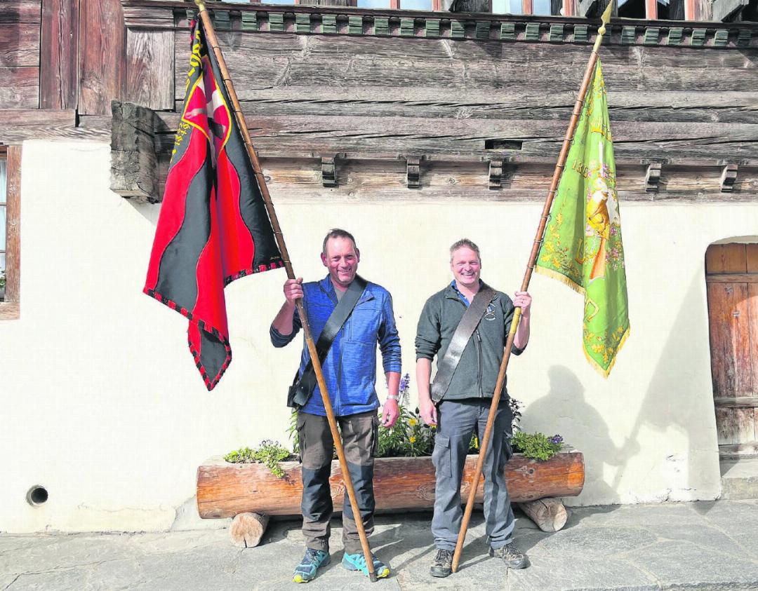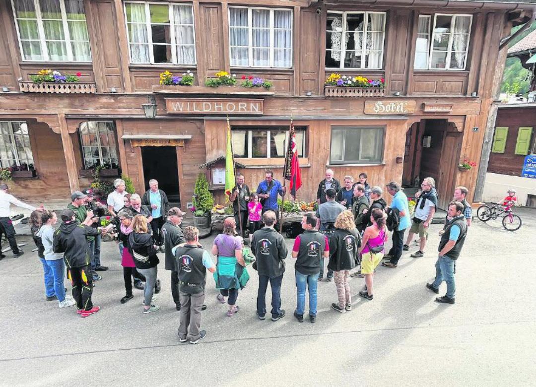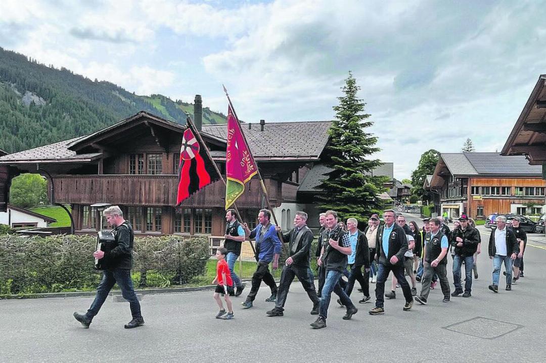 Nach der Preisverteilung fand der traditionelle Umzug vom Ferienlager zum Geltenhornplatz und zurück zum Hotel Wildhorn statt. Mit Bravour gab Heinz Annen mit seinen Akkordeonklängen alleine den Takt an, da sein Musikpartner und Bruder Stefan mit der Fahne den Umzug anführte. Vor dem Hotel Wildhorn wurden die beiden Fahnenträger Stefan und Ueli gebührend bei einem feinen Glas Wein und herrlicher Abendstimmung gefeiert – herzliche Gratulation! Natürlich durfte auch das «Lebehoch», gesungen von einigen Schützenkameraden und Jodelkollegen, nicht fehlen.