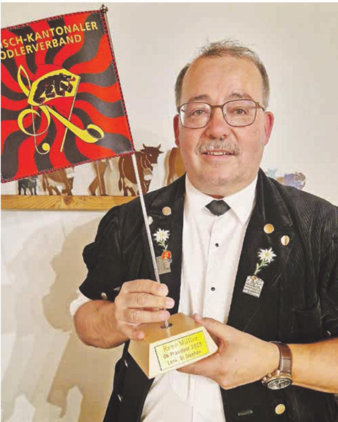 Anlässlich der Mitgliederversammlung des Bernisch-Kantonalen Jodlerverbandes vom Sonntag, 15. Februar, im Campus Perspektiven in Schwarzenbach/Huttwil hielt OK-Präsident René Müller Rückblick auf das Bernisch-Kantonale Jodlerfest Lenk-St. Stephan. «Mein OK-Team war mit bewundernswerter Hingabe am Werk, hat nichts dem Zufall überlassen und alles getan, um jede Herausforderung zu meistern. Zusammen mit allen Helfenden hat die ganze Region bewiesen, dass wir herzliche Gastgeber sind.» Als Anerkennung für seine Dienste wurde René Müller durch den Präsidenten des Bernisch-Kantonalen Jodlerverbandes, Rolf Christen, eine Tischstandarte überreicht und durch die Versammlung mit grossem Applaus beschert.