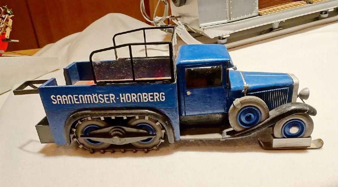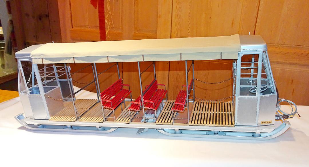 Stolz zeigte Roger Rieker das neue Modell eines Schlittens, im Massstab 1:10. Da keine Pläne mehr existierten, wurde der Schlitten Nr.1, der noch auf der Terrasse des Hotel-Restaurants Hornfluh steht, haargenau ausgemessen, damit er bis ins Detail nachgebaut werden konnte. Nachdem Vorstandsmitglied Daniela Kübli den offiziellen Teil beendet hatte, nahmen viele die Gelegenheit wahr, die ausgestellten Zeitdokumente zu betrachten und weitere «Müsterli» auszutauschen.