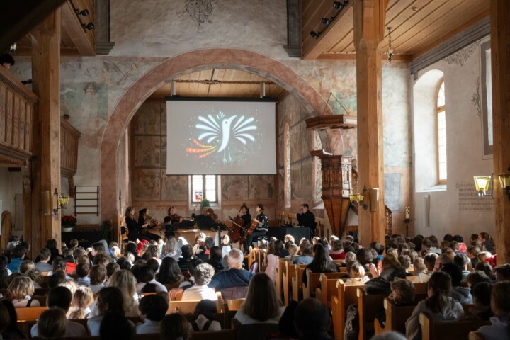 In der Kirche Saanen warteten am Dienstag um 10 Uhr zahlreiche Schulkinder und Gäste gespannt auf den Beginn der Aufführung. Das Festival Les Sommets Musicaux hatte den Zeichner Grégoire Pont und sechs Streicher:innen eingeladen, die eine rund 40 Minuten lange Aufführung von Beethovens «Symphonie pastorale» präsentierten. Das Konzert wurde von farbenreichen Animationen und Live-Zeichnungen begleitet, welche das Thema – die Schönheit und die Sehnsucht nach der Natur – visuell aufnahmen.